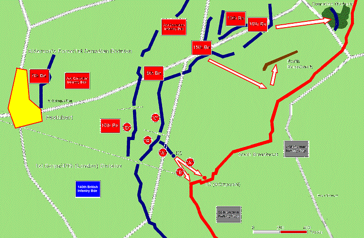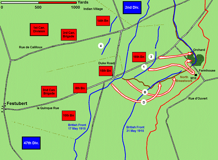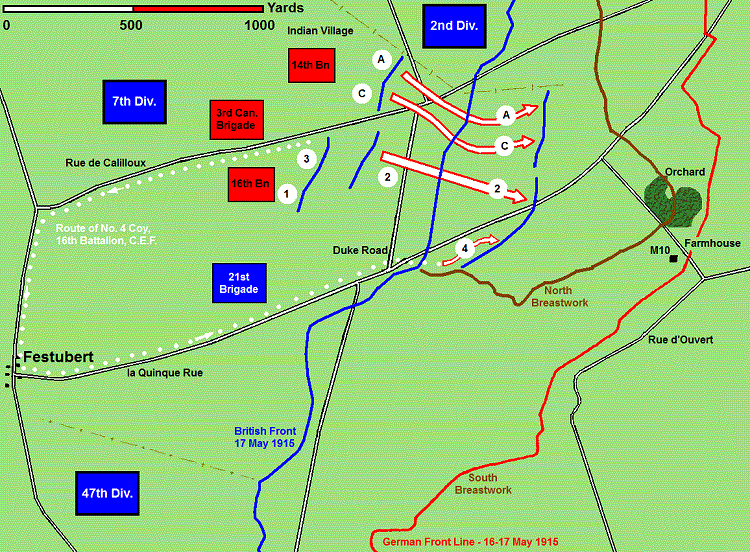 Haig's orders were not issued until mid-afternoon and received by the infantry brigade as Zero Hour approached. The two-hour preliminary bombardment was an hour late in starting, originally scheduled for 2:30 p.m. The Canadian attack did not go forward until 5:25 p.m. by which time the Guards Brigade had already been halted by German machine-guns - scarcely touched by the British artillery due to their positions still not having been precisely located.8 14th Battalion The 14th Battalion attacked with "A" and "C" Company forward; to their left the Guards Brigade, and to their right the 16th Battalion. Told not to expect serious opposition, they moved into the former German front line, and set off immediately into heavy shell and machine gun fire with an officer from 1/8 Royal Scots as a guide, aiming at a position known as "The Orchard" as their objective. Lieutenant-Colonel Burland, in charge of the assault companies, ordered the line to halt in the face of the devastating German fire and attempt to dig in. They were ordered on the night of 18-19 May to hand over their positions to the Guards and pull "A" and "C" Companies back to the former German line where "B" and "D" Companies had remained in reserve. "Both the attack and the withdrawal were made under trying conditions - in darkness, under constant fire, and across water-logged country seamed with deep ditches and old trenches." Some 65 other ranks were casualties, most of them fatal, including 18 NCOs. The 14th Battalion remained in support trenches until 22 May under constant shellfire, losing 75 other ranks killed and wounded, as well as one officer killed and another wounded while attached to the 13th Battalion.9 16th Battalion The Montrealers of the 14th Battalion had met fire from the same unlocated machine-guns that had harried the Guards and were diverted south, halted about 400 yards from their jumping-off trenches. The 16th Battalion (Canadian Scottish) had an adventure just assembling for the attack. In the early hours of 17 May, after the 3rd Brigade had received its orders attaching it to the 7th Division, the battalions had deployed in assembly trenches while the battalion C.O.s assembled for a brigade conference. The Brigadier desired to concentrate the four Canadian battalions at a cluster of houses known as Indian Village, but no roads connected the current billet site, requiring a cross-country march. Reconnaissance parties from each battalion returned after the brigade had been stood down, and at 8:00 p.m. the four battalions marched five miles through steady rain to new billets, a trek of two hours. The last troops were able to turn in by 1:00 a.m. on 18 May, and new orders arrived at 4:00 a.m., with demands that the brigade return to Indian Village. Officers of the 16th noted that the men were "dead tired" when they set out at 6:45 a.m., and the trip, cross-country, took until 4:00 p.m. As if that wasn't bad enough. No. 4 Company was detailed to make an end-around - march back, through Festubert, and up la Quinque Rue to make a flanking attack on The Orchard, a circuitous trip of some 5,000 yards. It was a complex plan, and a number of other variables threatened to unravel things. In addition to the inaccurate maps, printed upside down and with poor iconography, the frontal attack was to be made over ground laced with deep drainage ditches and abandoned German and Allied breastworks - entrenchments built up above ground because of the shallow water table which had ruled out the digging of trenches. No. 4 Company also had to rendezvous with a British staff officer somewhere in Festubert, as he was the only person who knew where the start line for their attack was going to be.