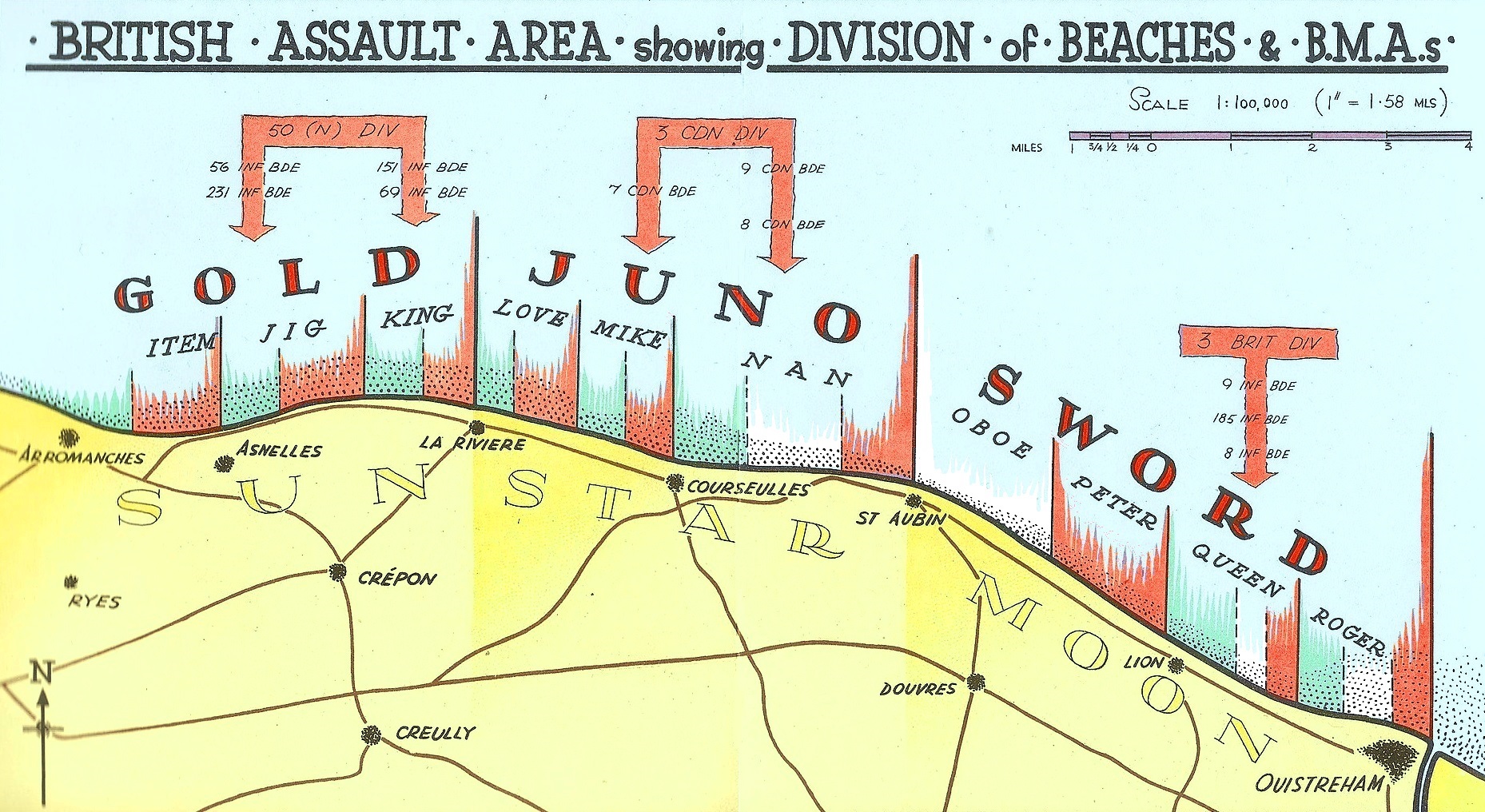 Beach Groups: Operation NEPTUNE The invasion of Normandy was an immense undertaking not only in terms of the number of divisions, men, and vehicles employed, but for the logistical support necessary to make it work. Among this logistical overhead was the Beach Groups. Maintenance of the bridgehead was to be done over open beaches, with the "Mulberry" artificial harbours not expected to be in place and operational until over a week following D-Day.1 The beaches were code-named consecutively from west to east using the phonetic alphabet. The three major beaches were GOLD, to be assaulted by 50th Infantry Division, JUNO, by 3rd Canadian Infantry Division, and SWORD, by 3rd Infantry Division. They were further subdivided into sectors and individual beaches as shown below.2