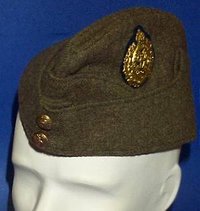 Note the lapels on the front of the blouse postwar battledress blouse above, the most prominent feature of 1949 Pattern BD. When purchasing supposedly original wartime BD, don't let insignia fool you - despite the wartime insignia on this blouse, it is most assuredly post war. The unusual chevrons on the sleeve are Canadian postwar issue. At right, re-enactor Jean Merrette of the Quebec-based Le Regiment de la Chaudiere Re-enactment Unit shows a wartime blouse, buttoned at the neck per regulation. The Battle Dress trousers were a fly-fronted pant with button closure made from the same wool material as the blouse. They featured a large map pocket on the left leg closed by a flap as well as a pleated First Field Dressing pocket on the upper right leg. The BD trousers were held up by the use of leather-tabbed braces (suspenders) that came in two main colours, white and khaki. There were also many instances of privately purchased trouser braces being used. Under the BD blouse, the most often worn item was the collarless Angola wool shirt. This was a greenish wool, and featured a half-front opening closed by several buttons. When the collar of the BD blouse was being worn open, the soldier could wear a khaki collared shirt with a black tie in the latter period of the war. Head DressThe main headgear worn by the Canadian Army in World War II was the Field Service Cap. This was a khaki "envelope" that was worn raked to the right side of the head. In 1943, the Army moved to the beret. This was the typical World War II style of beret with a 10 ½ inch crown. The universal colour was khaki, with black for Armour and maroon for Airborne units. Other units that had a distinctive cultural background (such as the Highland regiments) would wear specialized headgear such as a Caubeen, Tam O’Shanter or Balmoral. Every regiment or corps would have a cap badge that would be worn on their chosen headgear. This was made of a metal such as brass or sterling silver, with some units having different finishes according to the rank of the wearer. Some units would back their cap badges in fabric owing to unit traditions, such as a tartan backing for Highland regiments.
