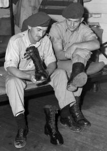 Postwar In Korea, a variety of boots were worn by Canadians, including foreign issued items. Combat Boots The Canadian Army adopted a rubber soled combat boot very similar to the 3rd Division Boots, though without the buckle and cuff. Three separate marks were produced. The early marks had a pronounced welt on the sole. Boot care was officially to be done with special preservative issued in metal tins rather than boot polish; in practice this was not often the reality. The combat boot was worn with Work Dress as well as the combat uniform, and continued in use with the new CADPAT uniforms also. Parade Boots Parade Boots (also known as Ankle Boots) were a stiffer, more formal style of boot very similar in appearance to the Ammunition Boot. They came to be worn as part of working, walking out, and parade dress. SSF Boots The SSF Boot or "Jump Boot" was a privilege extended to parachute qualified personnel, who wore the boots not only with field gear but also when in dress uniform. Garrison Dress Boots A high top boot with smooth leather issued with Garrison Dress. Cold and Wet Weather Boots A variety of cold and wet weather boots were also issued for muddy and snowy conditions.
