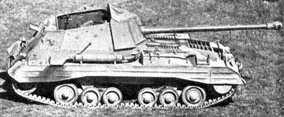 ![]() Used by anti-tank regiments in armoured divisions and corps troops. Two batteries of the armoured division's anti-tank regiment were so equipped, primarily to provide anti-tank support to the armoured brigade. Equipment: Armament - 17-pounder (field sighting gear), .45 calibre sub machine gun, smoke mortar, rifles. Observation - periscopes, binoculars, telescopic sight. Communication - No. 19 Wireless Transmitter set, interphone, signal pistol. Spares, tools, rations, etc. Power is provided by two engines, fuel and oil capacities are given for total. Open-topped vehicle, armour on turret shield 2-1/4", turret sides 1", hull front 1-1/2", hull sides 1".
