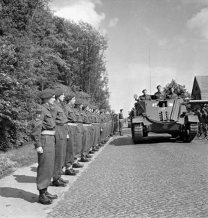 Archer![]() At least one anti-tank regiment made use of the Archer self-propelled anti-tank gun (photos of the 7th Anti-Tank Regiment, RCA using the Archer in Italy in Oct 1944 are shown in Tools of the Trade).4 The Archer was a variant of the Valentine tank armed with a 17-pounder gun. The vehicle was unique in having a rear-facing main armament, allowing the vehicle to be driven directly out of a firing position. The vehicle was small, but cramped (the driver had to vacate his seat when the gun was in operation lest he be seriously injured by the gun's recoil). The first production models were issued in Mar 1944, and a total of 665 were built. The gun had 11° of traverse, 15° of elevation and 7½° of depression. The vehicle had stowage for 39 rounds of ammunition. Armour ranged from 60-80mm and the vehicle had a crew of 4.5